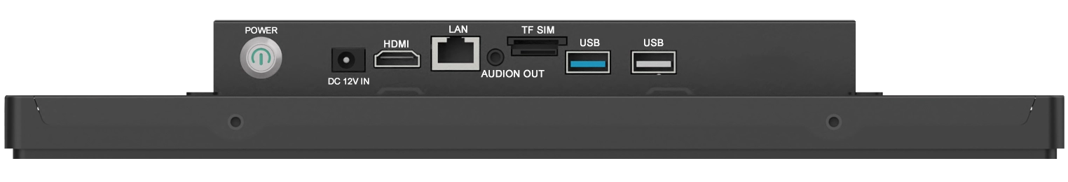 منافذ العرض: HDMI، مدخل تيار مستمر 12 فولت، منفذ LAN، منفذ TF، منفذ الطاقة، مخرج الصوت، ومنفذ USB