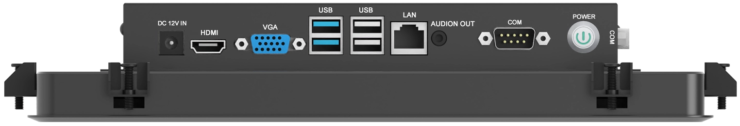منافذ العرض: HDMI، VGA، COM، MIC، LAN، USB، DCIN، صوت