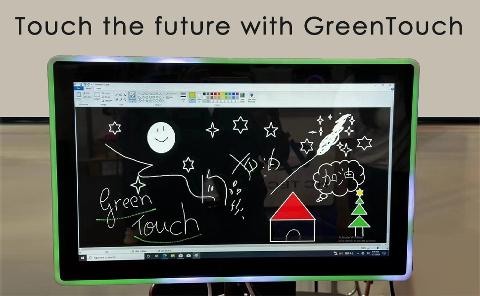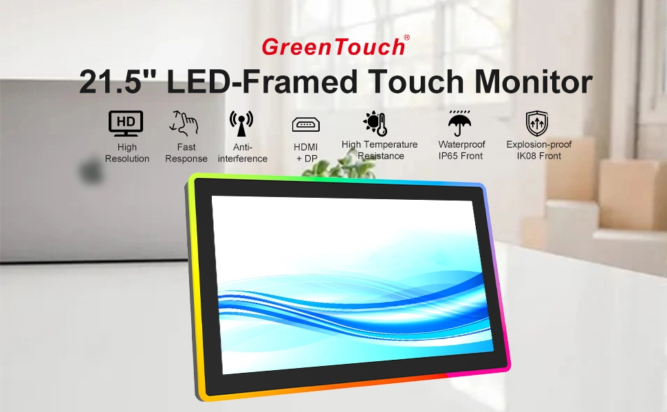 طورت شركة GreenTouch شاشة لمس فريدة وعالية الأداء، تُستخدم بشكل أساسي في الأماكن التجارية. تتوفر هذه الشاشة حاليًا بأربعة أحجام قياسية: 21.5 بوصة، 27 بوصة، 32 بوصة، و43 بوصة. يتميز الإطار الخارجي بتصميم عصري وملون لشاشة LED، مزود بجهاز تحكم عن بُعد لضبط إضاءة LED. يمكن للمستخدمين الاختيار بسهولة من بين مجموعة متنوعة من أوضاع الوميض RGB ذات الألوان السبعة (الأحمر، الأخضر، الأزرق، الأبيض، الأصفر، البرتقالي، البنفسجي)، مع دعم 358 نمط إضاءة مختلف. تشمل خيارات التخصيص توليف الألوان، والسرعة، والاتجاه، والتسلسل. تعتمد الشاشة على شاشة TFT LCD عالية الوضوح، وشاشة لمس سعوية حساسة، وشاشة LED صناعية أصلية من الدرجة A+. وهي متوافقة مع أنظمة Windows وAndroid وLinux.